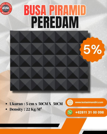 Busa piramid adalah acoustic foam bertekstur piramida yang berfungsi memecah dan menyerap gelombang suara. Dengan ketebalan 5 cm, daya serapnya lebih optimal dibanding busa tipis, sehingga cocok untuk ruang yang membutuhkan kontrol gema lebih serius.